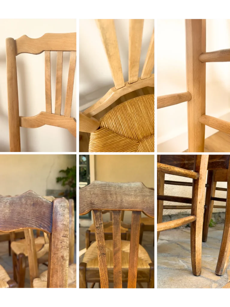 Rénovation d’un lot de chaises anciennes paillées. Un changement de teinte apportant modernité et cohérence avec le nouveau projet de décoration intérieure.