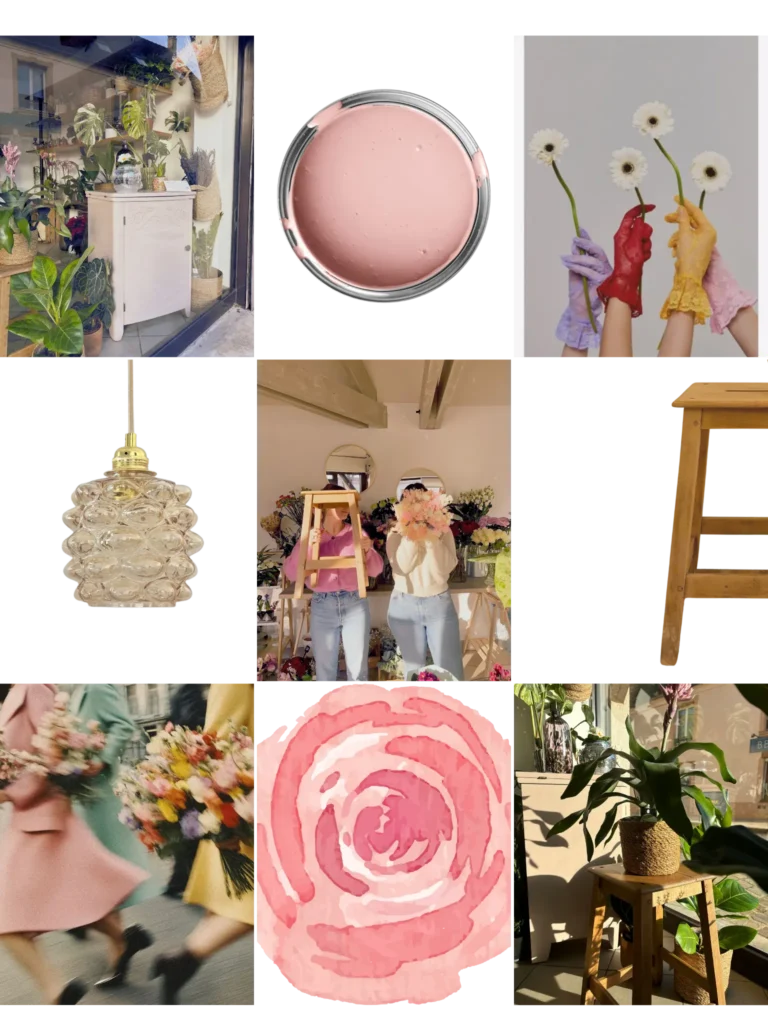 Mobiliers sourcés et rénovés pour une boutique de fleuriste, pensé pour s’adapter au lieu et structurer la présentation des compositions florales.